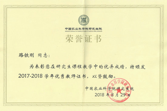 近日,我所路铁刚研究员被评为中国农业科学院研究生院2017-2018学年优秀教师,这是路铁刚研究员第四次被评为中国农业科学院研究生院优秀教师,也是我院唯一一位连续四年获此殊荣的授课教师。