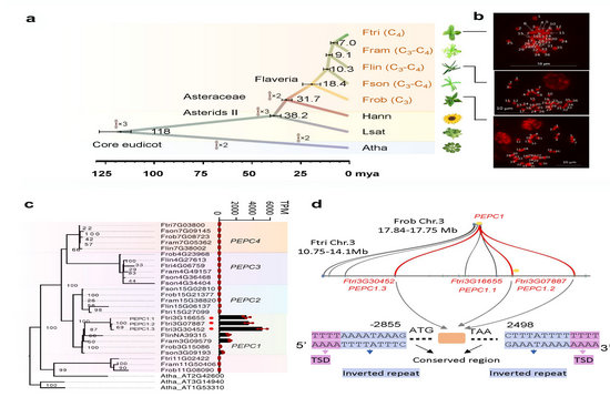 黄顶菊属包含了C3、C4及C3-C4中间型物种,是研究C4光合作用演化机理的理想材料。研究发现无论C3还是C3-C4中间型物种中均存在编码C4途径关键酶(如CA、PEPC、PPDK等)和转运蛋白基因,且其在染色体上的定位高度保守,但这些基因在C3物种中表达水平很低且不参与光合作用。C4物种黄顶菊属(Flaveria)中C4关键基因PEPC1拷贝数增加了两个,且在其上下游2.5-2.8kb处发现了反转座特异的关键特征序列,表明PEPC1的新拷贝可能是通过逆转座事件产生,由此推测C4物种中C4基因表达水平的提高可能部分归因于反转座子驱动的基因拷贝数增加。