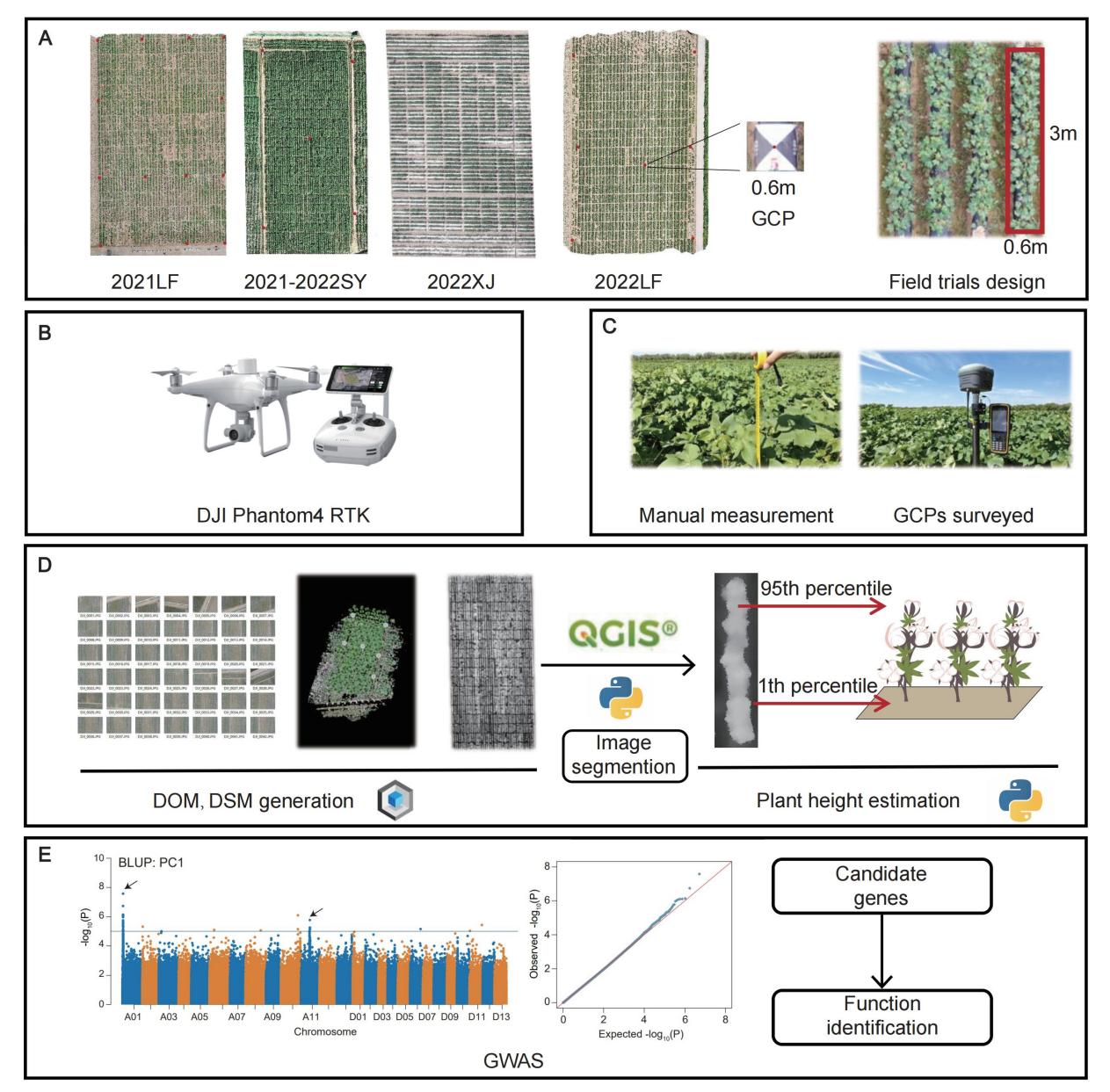 图:无人机表型平台结合GWAS解析棉花株高分子机制流程图