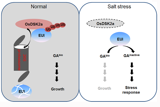赤霉素是调节植物生长发育的重要激素,但人们对其在逆境胁迫中的作用机制研究较少。泛素-蛋白酶体系统是生物体内蛋白质降解的一条重要途径,其中泛素受体蛋白起到类似“摆渡车”的作用,将被降解的靶蛋白转运到蛋白酶体中,从而调控蛋白稳定性。泛素-蛋白酶体系统在植物逆境胁迫应答中具有重要的调控功能,但是泛素受体蛋白是否参与植物盐胁迫应答尚不清楚。该研究发现水稻OsDSK2a可作为泛素受体在蛋白质降解和信号转导中起作用,同时OsDSK2a调节植物生长发育和赤霉素代谢。进一步研究证明OsDSK2a与赤霉素代谢负调控因子EUI相互作用,OsDSK2a像“摆渡车”一样将EUI带到蛋白酶体进而将其降解。更为重要的是,盐胁迫可以使OsDSK2a水平降低,导致EUI蛋白积累增加,从而降低活性赤霉素含量,实现盐胁迫对植物生长的抑制作用。