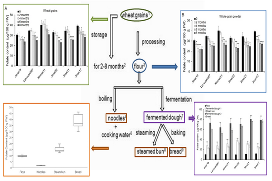 叶酸(Folates)属于水溶性B族维生素(B9),是维持生命活动正常进行的重要功能因子。人类自身不能合成叶酸,主要依赖于从食物中摄取。小麦是世界三大粮食作物之一,是我国特别是北方地区重要的主食之一。前期研究中,张春义团队和作物科学研究所叶兴国团队合作,全面分析了我国北方地区316份小麦品种的叶酸含量,发现多个富含叶酸的小麦品种可直接种植食用,或作为优异种质资源用于新品种培育。但是由于叶酸分子较不稳定,极易降解或转化,因此如何保证存储、加工及烹饪过程中的叶酸含量成为关键。两团队继续合作对小麦籽粒存贮、面粉加工及面食制作(面包、馒头、面条)中叶酸保留展开系统分析。发现,室温存贮4个月起小麦籽粒叶酸含量开始出现下降(14-16%),存贮8个月下降较为显著,达26%;面粉加工会导致叶酸严重损失,保留率仅为29%。不同的烹饪方式也会影响面食中的叶酸含量,对比煮后面条、蒸后馒头和烘焙后面包中的叶酸含量,结果表明,煮沸会导致面条中叶酸大量损失,而蒸馒头或烘焙面包包含发酵过程,能够显著提高加工食品中的叶酸含量(1.5-4倍),因此馒头和面包可优先作为叶酸摄入来源。