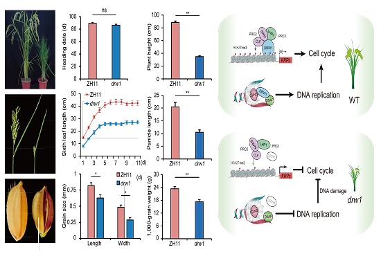作物生长发育过程中,高温、干旱等非生物胁迫会引起细胞增殖被抑制,集中能量用于抗逆,往往导致作物不同程度减产。在细胞分裂过程中,遗传信息和表观遗传信息都需要完成从母本细胞到子细胞之间的转移,因而,鉴定其中调控基因和网络可望为提高作物产量和抗逆性提供基因资源和理论基础。我们在水稻中鉴定了酵母CTF4同源蛋白DRW1,DRW1招募多梳家族(Polycomb,PcG)复合体成员以维持分裂细胞中组蛋白H3第27位赖氨酸三甲基化(H3K27me3)修饰水平,参与细胞周期中的DNA复制。此外,DRW1通过与DNA解旋酶复合体成员GINS和DNA聚合酶DNAP互作来调控细胞周期S期DNA复制和损伤修复。与酵母和哺乳动物相比,我们发现水稻DRW1不仅参与影响DNA解旋酶活性、细胞周期S期DNA复制和损伤修复,还特异地影响细胞周期中的表观遗传信息传递,表明DRW1在进化过程中即呈现保守的生物功能,又分化出特有的表观调控机制。此外,与拟南芥CTF4同源蛋白(EOL1)比较分析发现,水稻DRW1和拟南芥EOL1虽然都在分裂细胞旺盛的组织中表达,均能够与PcG复合体成员直接相互作用,并共同促进H3K27me3修饰水平沉积,但在调控下游的生物学过程显著不同,导致水稻中DRW1突变后存在明显表型。水稻DRW1参与调控细胞周期相关基因KRPs,而在拟南芥中KRPs却不受EOL1的影响。此外,拟南芥EOL1突变后也不影响DNA损伤,进一步表明了CTF4的同源蛋白DRW1和EOL1在单双子叶植物中存在功能分化。