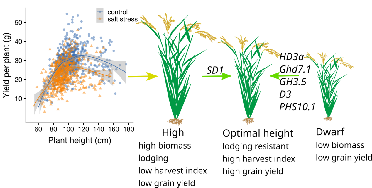 图示:利用有利单倍型调节株高平衡生长与胁迫响应是培育高产耐盐作物品种的新策略