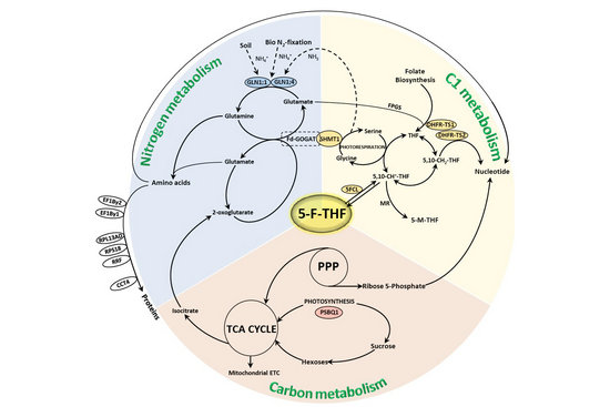 本研究将5-甲酰四氢叶酸(5-F-THF)与光亲和标签(Dayne)共价偶联形成稳定的探针,经验证,该探针仍保持被拟南芥幼苗吸收、代谢和利用的生物学活性。利用该探针结合点击化学(click chemistry)和亲和蛋白质组学技术共鉴定到51个叶酸互作蛋白,并从中筛选出16个高亲和力互作蛋白和14个低亲和力互作蛋白。生化分析与功能预测显示,叶酸分子通过与这些蛋白的互作将一碳代谢、碳代谢和氮代谢三条代谢途径联结在一起。进一步研究还分析了2个高亲和互作蛋白二氢叶酸还原酶/胸苷酸合成酶(AtDHFR-TS1)和谷氨酰胺合成酶1;4(AtGLN1;4)与叶酸分子结合的位点及酶活变化。上述结果从蛋白组学角度开拓了对叶酸生物学功能的认识,为深入探索叶酸在植物发育中的作用机理奠定基础。