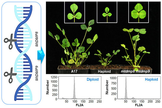 研究人员发现玉米单倍体诱导基因ZmDMP在蒺藜苜蓿、紫花苜蓿、大豆等豆科牧草和作物中具有较高的保守性。进一步利用紫花苜蓿近缘种的二倍体蒺藜苜蓿为研究系统,发现通过基因编辑技术对蒺藜苜蓿中ZmDMP同源基因MtDMP8和MtDMP9同时敲除可以诱导产生单倍体。在此基础上,利用mtdmp8 mtdmp9双突变体与不同生态型蒺藜苜蓿亲本杂交可以诱导产生母本来源的单倍体材料,证明ZmDMP同源基因在豆科植物中具有母本单倍体诱导功能。该项研究工作利用基因编辑技术首次将ZmDMP介导的玉米单倍体诱导体系成功拓展至豆科植物中,为解析豆科植物单倍体诱导机制,创建紫花苜蓿、大豆等豆科牧草和作物单倍体育种技术体系奠定重要基础。