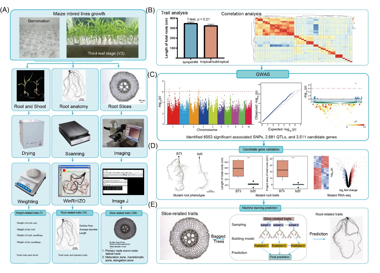 玉米根系的多样性决定了其固根能力、养分吸收及抗逆性,对产量有至关重要的影响。然而,植物根系地下特性和表型检测方法的局限性给育种选择带来了很大的挑战。本研究对316个玉米品种的根系构型及细胞结构展开深入研究,获取了131个根部性状数据,发现热带/亚热带与温带玉米品系在部分根部性状上存在显著差异,通过全基因组关联分析(GWAS),鉴定出大量根系调控基因,证实了岩藻糖基转移酶 5(FUT5)在根系发育及耐热性中的重要作用,其不同单倍型与主根特征存在关联,具有育种应用潜力。此外,开发了根系表型机器学习预测模型 PRSA,结合根切片微表型数据实现根系结构智能预测,突破了传统表型检测瓶颈。该成果与前期研究(Molecular Plant, 2023)共同构建了玉米地上 - 地下、宏观 - 微观全方位表型分析体系,运用机器学习算法,构建高预测精度的表型预测模型,实现对复杂农艺性状的早期精准预测,为玉米及其他作物智能设计育种提供关键技术支撑。