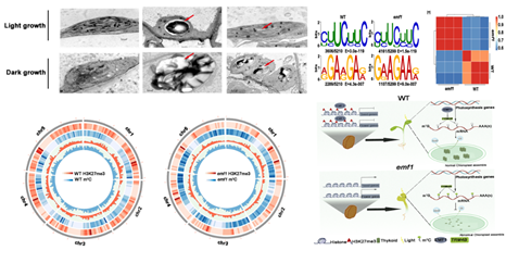 研究发现植物特异Polycomb(PcG)蛋白EMBRYONIC FLOWER1(EMF1)介导RNA甲基化m5C和组蛋白甲基化H3K27me3在全基因组水平上的协作关系,在植物营养生长阶段可同时作为抑制子和激活子调控特定的开花、种子发育以及叶绿体发育和光合作用等关键下游靶基因转录。一方面,EMF1通过组蛋白甲基化(H3K4me3)调控RNA甲基转移酶TRM4B的表达,影响RNA甲基化m5C修饰在叶绿体发育和光合基因上的富集,进而激活这些基因的表达(EMF1-TRM4B-m5C)。另一方面,EMF1又可以通过PcG途径影响组蛋白甲基化H3K27me3修饰在花器官、种子和淀粉等发育基因上的富集,进而抑制这些基因的表达(EMF1-PcG- H3K27me3)。两个不同的作用方式精确调控了植物正常的营养生长,促进了植物的光合作用,从而为种子的形成积累了能量。该研究不仅为植物表观遗传/基因组学相关研究提供了重要数据资源,而且深入揭示了RNA甲基化在染色质表观修饰可塑性的贡献,并为复杂的表观调控网络在作物高光效、高产等基因转录调控中的作用提供了新认知。