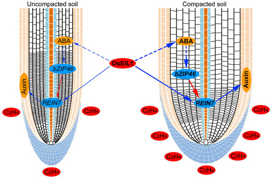 本研究发现,紧实土壤抑制水稻根的生长,与ABA的作用类似。阻断植物体内的ABA合成增强了根穿透紧实土壤的能力。进一步研究发现ABA通过OsbZIP46激活生长素合成基因OsYUC8的表达,促进生长素在根中的积累,最终导致短而粗的根,降低了根的钻地性。本研究阐明了ABA通过生长素调控水稻根系响应外界土壤硬度的分子机制,丰富了植物根系响应土壤紧实度的分子途径,为未来选育钻地能力强的水稻新品种提供理论基础和有用的基因。