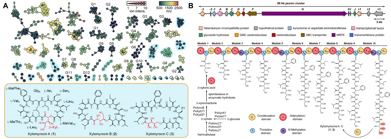 图注:A. 真菌杀虫环肽新家族木糖酸肽的发现。B. 木糖酸肽的生物合成机制