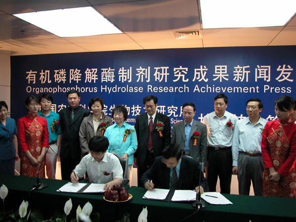 中国农业科学院生物技术研究所所长林敏与北京佳农新贸易发展有限公司董事长丁毅分别代表转让方和受让方在技术转让合同书上签字,双方表示,要充分发挥双方技术和市场运做两个方面的优势,强强联合,密切合作,加快该研究成果的产业化进程,使有机磷降解酶制剂产品尽快投放市场,及早地送到千家万户的手里,并将“有机磷农药降解酶制剂”起名为 “比亚”降解酶,预计在今年年底正式投产。