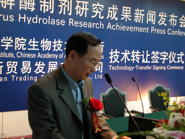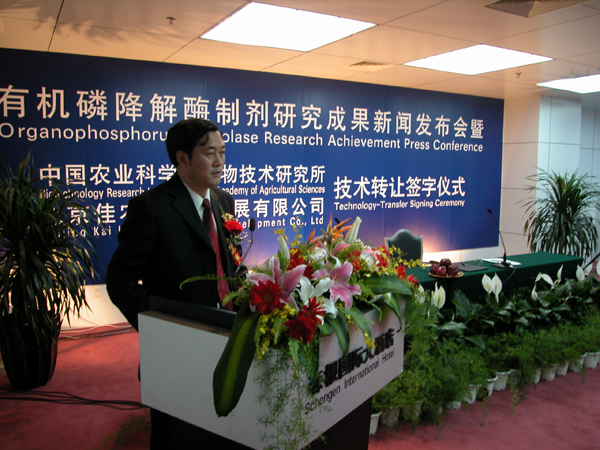 农业部科学教育司副司长石燕泉和中国农业科学院副院长雷茂良作了重要讲话。石燕泉副司长说,农药是现代农业不可缺少的生产资料,其中有机磷农药是应用较广泛的一类,一直在国内外大量生产并大面积使用。有机磷农药真正用于毒杀病虫害的量通常仅占施用总量的很少部分,其余大部分的农药都直接进入土壤、水和空气,导致蔬菜、瓜果及动物性食品上的农药残留增加,造成了环境和食品的污染,同时,给我国农产品的出口创汇带来了一系列的问题。“有机磷农药降解酶制剂”的研制成功,不仅为大量廉价生产有机磷降解酶制剂奠定了很好的基础,对于有效解决有机磷农药污染环境和食品具有重要意义,而且突破了技术方面的贸易壁垒,为解决我国农产品出口创汇,增加农民收入也具有重要意义。同时,“有机磷农药降解酶制剂”的研制成功,还探索了出了一条科研单位与企业快速结合,将科研成果尽快转化为生产力的新路。希望技术转让方和受让方发挥各自的优势,将有机磷降解酶制剂产品做大做强,争取国家政策和资金的支持,加快完善工艺技术,加大市场开拓力度,尽快将产品推向市场,造福于人类。雷茂良副院长首先对“有机磷农药降解酶制剂”研究成果和技术转让成功表示祝贺,他说,生物技术研究所成立20年来,在国家有关部委的大力支持和关怀下,生物技术研究所的全体科研人员艰苦奋斗、不断拼搏、努力创新,取得了一系列具有国际领先水平的科研成果,对国民经济的发展和农民增收起到了重要作用。我们的研究单位、我们的科研人员不但要在理论上站在科技创新的前沿,而且要紧紧围绕国民经济发展的需求创造我们的成果,直接为国民经济建设服务,在这方面生物技术研究所的定位是正确的、准确的。北京佳农新贸易发展有限公司很具有战略发展眼光,能与生物技术研究所一拍即合,说明企业对市场很敏感??蒲谐晒淖?,市场的开发,仅靠科研单位不行,要与企业结合,强强联合、优势互补,才会取得明显的经济和社会效益。我相信这一具有国际领先水平的科研成果,在北京佳农新贸易发展有限公司和中国农业科学院生物技术研究所的共同努力下,一定会为我国的生态安全、食品安全和人民群众的健康做出应有的贡献!