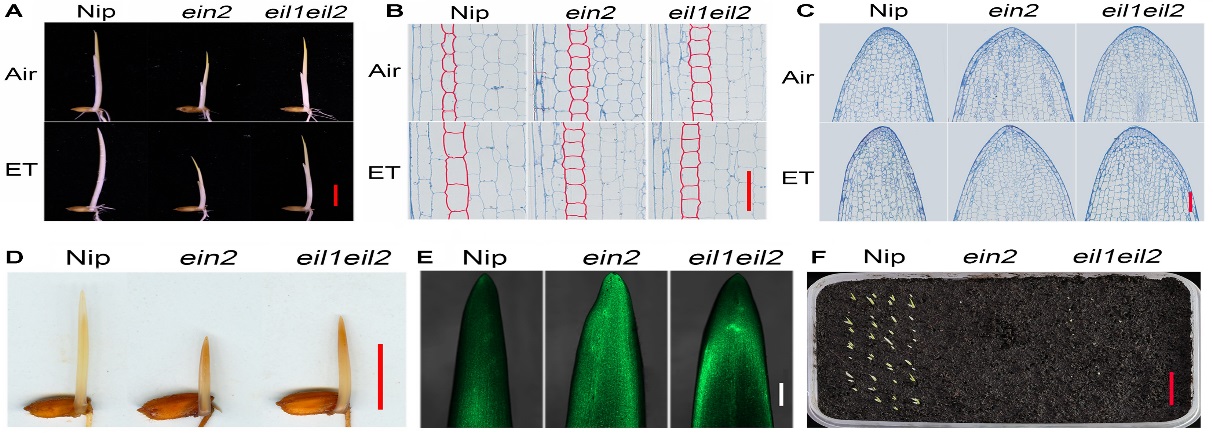 水稻是全球最重要的粮食作物之一,也是保障世界粮食安全的战略作物,养活了世界上60%的人口。作为半水生作物,水稻需要长期对抗低氧环境。水稻的胚芽鞘能通过伸长使真叶尽快接触氧气和光,在低氧、无光环境下?;ふ嬉叮运居酌绲男翁ǔ捎绕渲匾?。已有研究表明乙烯能够促进胚芽鞘的生长,然而目前关于乙烯促进胚芽鞘的生长的分子机制研究还比较少。