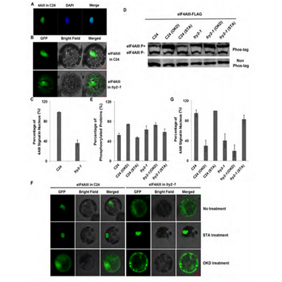 FIERY2是一个去磷酸化酶,它与能控制RNA Pol II的C末端磷酸化水平的磷酸化酶同源。以前的实验发现,FIERY2能控制HOS5的磷酸化水平进而影响了pre-mRNA剪切和microRNA产生(见前期研究PLoS Genetics,2013和Nucleic Acids Research,2015)。研究发现FIERY2能和NMD的核心组分eIF4AIII和UPF3相互作用并控制eIF4AIII的去磷酸化,并且通过加入STA(激酶抑制剂)可以在fry2-1突变体内恢复eIF4AIII的磷酸化平衡。而eIF4AIII的磷酸化水平决定了其在细胞内的定位,正确的核内定位是eIF4AIII行使功能所必须的。进一步通过位点突变找到了控制eIF4AIII定位的氨基酸位点。通过RNA-seq分析发现NMD识别对象在fry2-1突变体内显著积累,此积累可用蛋白激酶抑制剂在fry2-1突变体内恢复。上述研究工作系统地揭示FIERY2通过控制eIF4AIII磷酸化水平调控植物mRNA质量控制体系的作用机制。