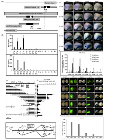 本论文首先分析一对双向基因ZmDef1/ZmDef2的表达谱,初步确定了其启动子的特性,并克隆出两个基因翻译起始位点上游的2.0 kb基因组序列作为潜在的单向启动子PZmDef1/PZmDef2,以两个基因翻译起始位点之间的635 bp基因组序列作为潜在的双向启动子PZmBD1。随后,分别构建在单向和双向启动子下游融合报告基因GUS,在双向启动子两端分别融合GUS和GFP两个报告基因的表达载体,通过玉米幼胚瞬时表达结果表明克隆的基因组序列均具有启动子的功能。进而通过玉米稳定转化结果证明GUS和GFP重现了内源基因ZmDef1/ZmDef2的表达模式,证实了单向启动子PZmDef1/PZmDef2是胚特异性启动子,而PZmBD1则是一个胚特异不对称双向启动子。对PZmBD1进行全面的缺失分析后发现一些顺式作用元件互作调控启动子的强度和转录方向并提出了双向启动转录表达调控的模型。