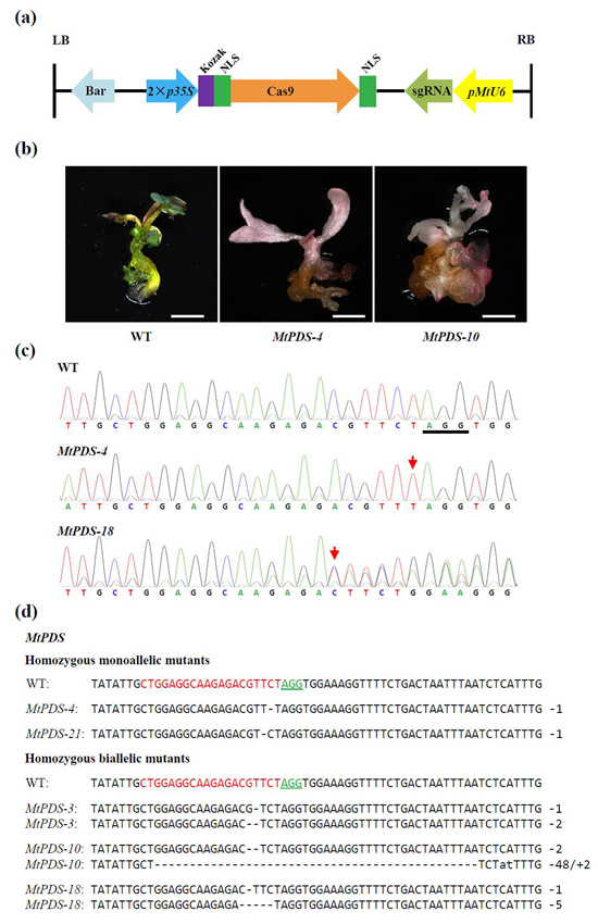 CRISPR/Cas9基因组编辑系统以其设计简便、编辑高效等特点已在拟南芥等模式植物和水稻等农作物的基因功能解析和遗传改良方面广泛使用,但目前该技术在苜蓿等豆科牧草中的应用还没有成功报道。在本研究中,科研人员发展了一个适用于农杆菌介导的优化的CRISPR/Cas9基因组编辑系统,利用该系统成功对豆科模式牧草蒺藜苜蓿(Medicago truncatula)的PDS基因进行定点敲除,并在T0代得到了比例达到10.35%的纯合敲除突变体。本项研究工作拓展了CRISPR/Cas9技术的应用范围,同时为苜蓿等豆科牧草的功能基因组学研究以及遗传改良提供了新的研究工具。
