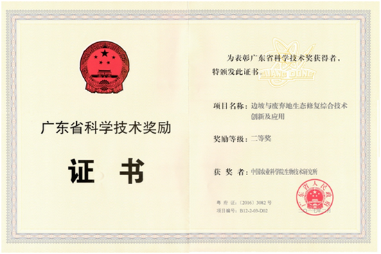 2017年2月,我所与深圳市铁汉生态环境股份有限公司、深圳市中国科学研究院仙湖植物园和中国科学院植物研究所共同承担的“边坡与废弃地生态修复综合技术创新及应用”项目,获得了广东省人民政府颁发的广东省科学技术二等奖证书。我所吴燕民研究员、周美亮副研究员、孙占敏博士后均为该奖项的获奖人。
