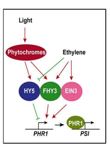 王海洋研究团队发现,光作为调控植物生长和发育最重要的环境信号因子之一,可以促进PHR1基因的表达。三个重要的光信号转导因子(FHY3,FAR1和HY5)可以直接与PHR1启动子结合,其中FHY3和FAR1促进,而HY5抑制PHR1的转录。另外,植物激素乙烯通过其信号转导关键转录因子EIN3 直接激活PHR1的转录。FHY3还可以和EIN3 直接互作,而HY5能够抑制FHY3和EIN3对PHR1的转录激活。光和乙烯都可以促进FHY3蛋白的积累,而乙烯可以抑制HY5蛋白的积累。这些研究结果表明光和乙烯通过信号整合于PHR1的启动子,来协同调控植物PHR1的表达和磷饥饿反应。该研究不仅加深了我们对植物磷饥饿反应分子调控机理的理解,也为培育磷高效利用作物新品种提供了理论依据。