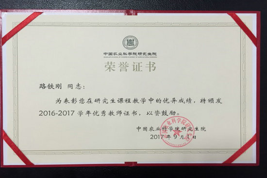 近日,我所路铁刚研究员被评为中国农业科学院研究生院2016-2017学年“优秀教师”称号,并颁发了荣誉证书,这也是路铁刚研究员连续三年获此殊荣。