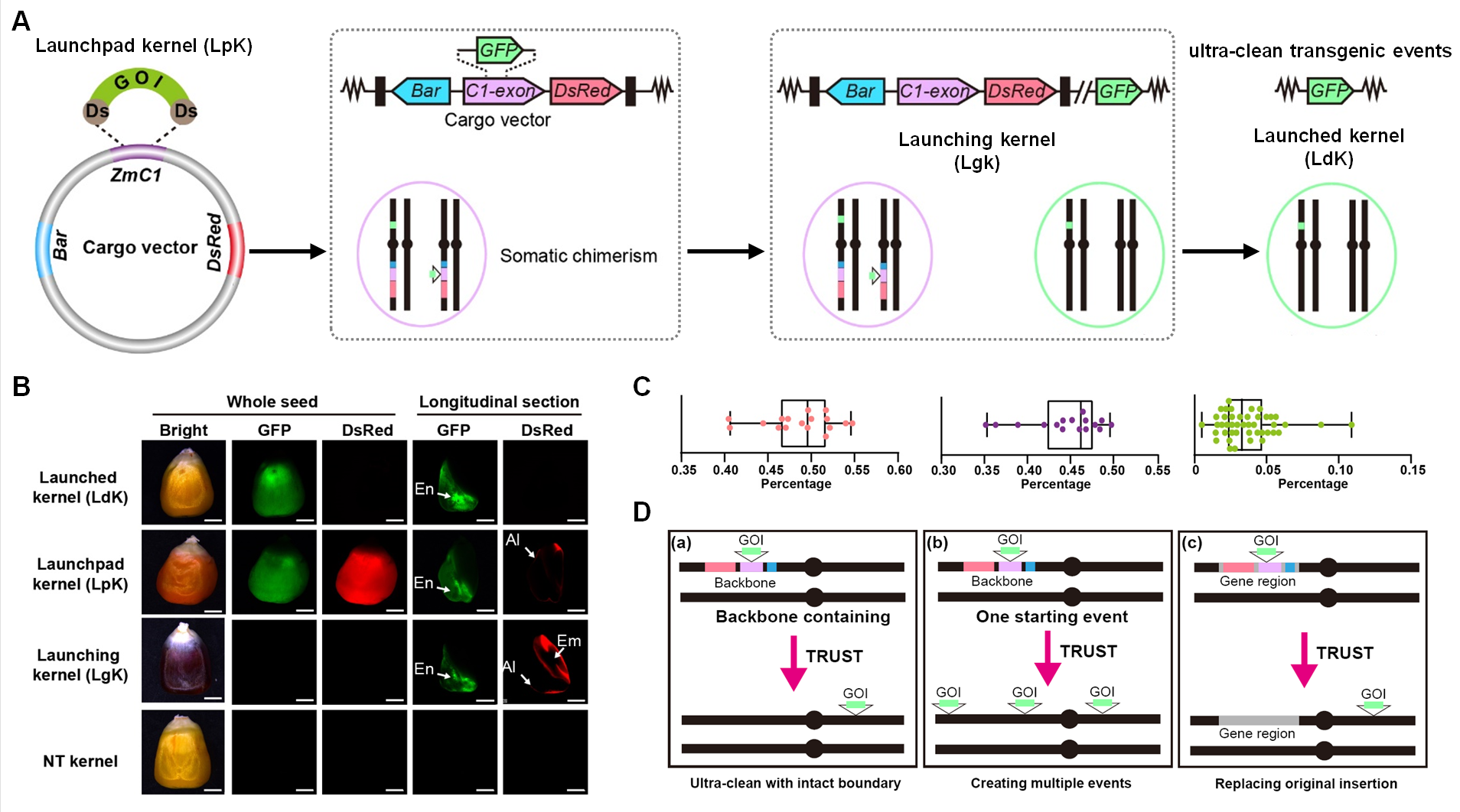 荧光蛋白和花青素标记精准追踪目标基因与载体骨架的分离过程,为彻底移除外源载体骨架和筛选标记提供了一种高效、可视、可控的方法。同时,利用TRUST技术能从一个初始转化体中获得多个独立转化事件,让转化效率低的作物也能高效增加转化体数目。TRUST技术已申请中国发明专利,可用于优质高产多抗玉米及其他作物新种质的创制,对加速推进转基因作物产业化具有重大价值。
