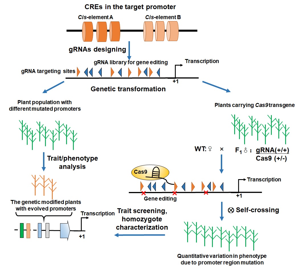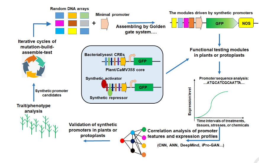 论文总结了启动子结构研究以及表达强度预测的研究进展。目前研究发现绝大多数基因的主要的调控区间在-200 to +51 bp区域,控制了90%以上的基因表达强度,这也是启动子人工设计的关键目标之一。论文还提出了人工启动子设计的当前路径:一是最小启动子策略。该策略通过随机合成寡核苷酸或者构建不同的顺式元件组合, 然后将其与Mini 35S或者核心启动子相连接,驱动报告基因的表达。通过对启动子的测序以及报告基因的表达分析,从而获得人工智能分析所需的海量数据。在此基础上,通过构建模型来预测启动子的强度并指导人工启动子的设计。二是启动子定向进化策略。该策略基于植物细胞内存在的天然启动子,通过基因编辑产生的饱和人工突变,在植物体内构建不同的人工启动子。通过对携带人工启动子的植株进行田间表型分析,确定育种中的候选种质材料。这种方法已经广泛应用到作物抗病、株型、产量育种之中。