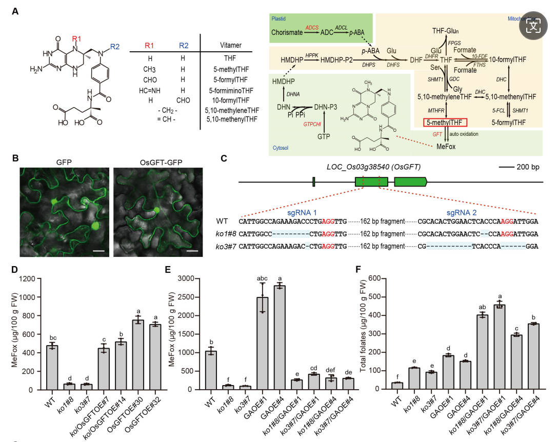 团队前期发现,禾谷类籽粒如水稻、玉米、谷子中积累大量不具生物活性的氧化叶酸,并研究鉴定玉米谷氨酸亚胺甲基转移酶1(ZmGFT1)为叶酸调控关键候选基因。本研究对水稻OsGFT的生物学功能进行分析,结合基因编辑技术,发现敲除OsGFT可阻断氧化叶酸形成,促进活性叶酸含量提高3倍。过表达叶酸合成基因也能显著增加氧化叶酸含量,进一步在过表达水稻材料中叠加OsGFT敲除,总活性叶酸提高至13倍。这些研究结果为作物叶酸强化精准调控提供新策略。