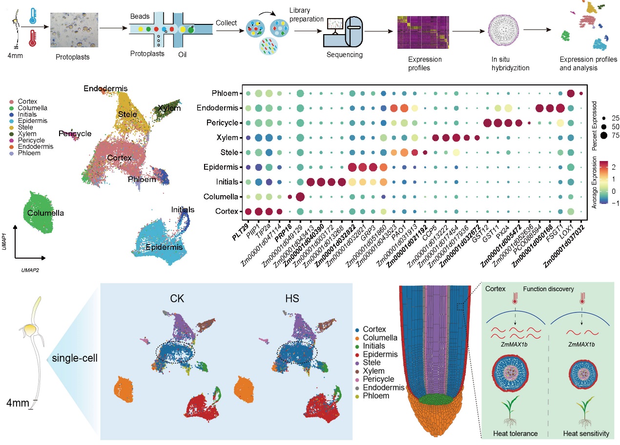 近日,中国农业科学院生物技术研究所玉米功能基因组创新团队首次在单细胞水平解析了玉米根系细胞对热胁迫的特异性响应机制,揭示了热胁迫下植物根系的细胞异质性、根系类型的差异和分化轨迹,鉴定了单双子叶植物响应热胁迫的关键核心基因,相关研究成果发表在国际知名学术期刊《自然通讯(Nature Communications)》。