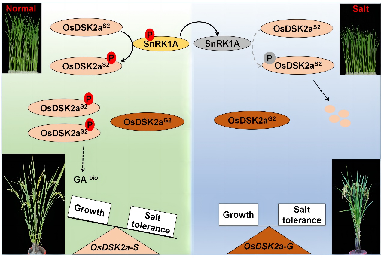 团队发现,水稻中保守的能量代谢激酶SnRK1A可以让影响水稻生长发育和耐盐性的协同调控因子OsDSK2a磷酸化并保持其稳定性,并能通过应答盐胁迫调节OsDSK2a蛋白丰度,平衡水稻的产量和耐盐性。进一步分析发现OsDSK2a磷酸化位点存在自然变异,其优异等位基因在耐盐水稻分子育种中具有潜在应用价值。该研究成果为水稻耐盐性遗传改良提供了新的基因资源和理论基础。