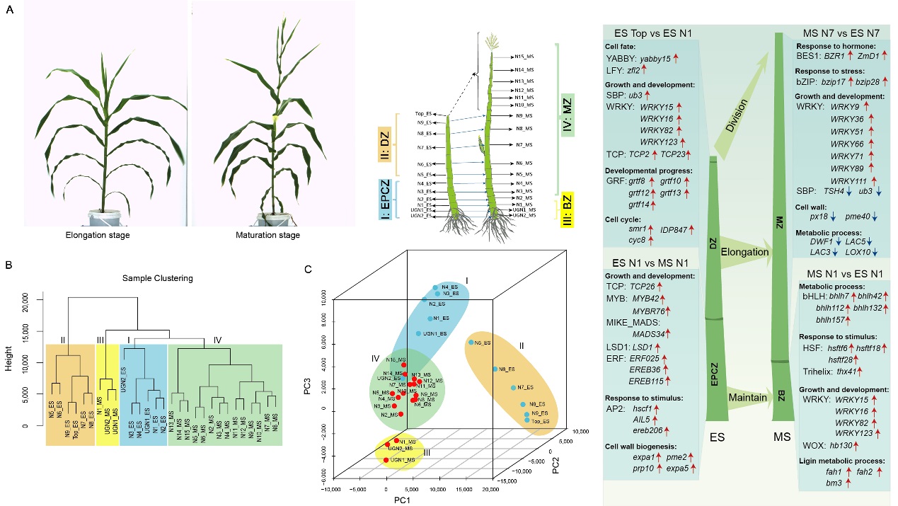 株高是最重要的株型性状之一,对玉米生长、光合作用、抗倒伏性和农机收割都有重要影响,是决定玉米产量的关键因素之一。株高主要取决于玉米茎秆节间数和节间长度,合理的株高才能促进玉米丰收高产。随着基因组学、生物信息学及预测模型的快速发展,目前已鉴定出一些玉米节间发育和株高相关的调控基因,然而对于玉米节间发育的系统研究和调控机制仍缺乏深入理解。