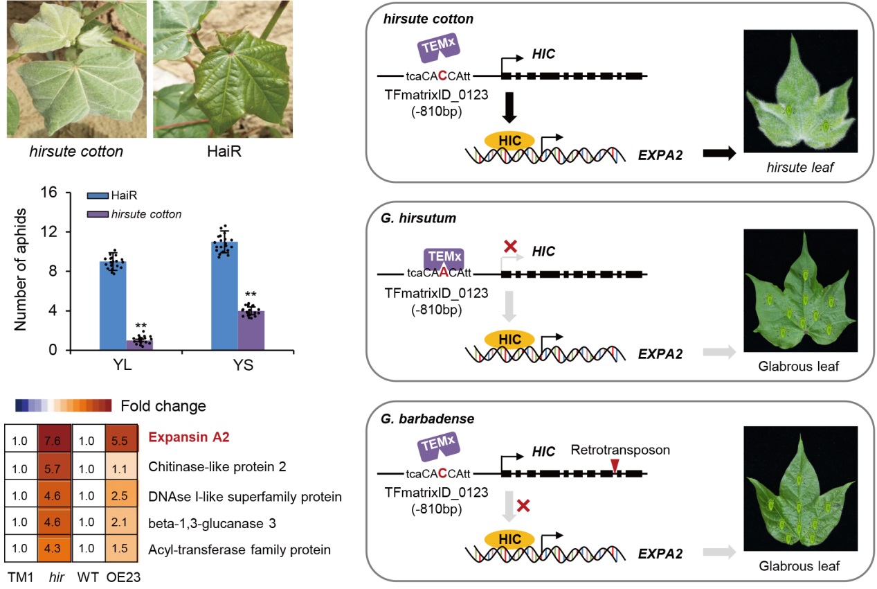 表皮毛不仅是研究植物细胞发育的理想模型,还是作物对抗蚜虫等生物胁迫的重要物理屏障。然而,对其发育调控机制的了解仍较为有限。该研究筛选定到一表皮毛密度显著增加的陆地棉材料hirsute cotton,通过构建大规模F2遗传群体,利用图位克隆方法,确定了控制棉花表皮毛增多的关键基因HIC。HIC通过直接结合并激活GhEXPA2基因的启动子,调控表皮毛的发育起始和数量。进一步研究表明,HIC基因启动子-810bp处的A到C突变导致TFmatrixID_0123元件功能丧失,使得负调控因子GhTEMx无法结合,从而引发hirsute cotton的多毛表型。值得注意的是,尽管海岛棉中HIC基因启动子也发生了相同的突变,但由于编码区Retrotransposon的插入导致基因功能异常,叶片表现出少毛表型。hirsute cotton中表皮毛数量和分支的增加,有效降低了蚜虫的趋向性和取食损伤。