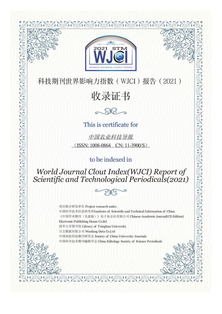 近日,由中国科学技术信息研究所等机构联合研制的期刊评价报告《世界期刊影响力指数(WJCI)报告》(2021版)(简称《WJCI报告》)发布,《中国农业科技导报》入选,期刊世界影响力指数(WJCI)为2.104,在134种农业科学综合学科入选期刊中排名36,位列Q2区。在此,我们诚挚感谢各位编委、专家、作者和读者的支持,并将一如既往为大家提供优质的服务,竭诚为大家搭建良好的学术交流平台,同时继续与大家携手并进,着力提升国际竞争能力!