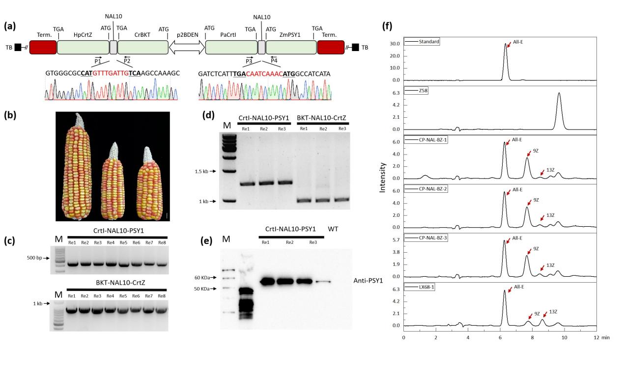 开发高效精确、互不干扰的多基因共表达系统对生物育种有重要意义。本研究选取了来自真菌的26-nt的基因间隔区,在玉米原生质体瞬时表达系统进行了功能验证与作用机制探索,确定其只在核酸水平发挥作用不形成多肽,团队将其命名为核酸连接子NAL(Nucleic Acid Linker)。随后,将其中一个9-nt的高效突变体NAL10在人类293T细胞中进行了功能验证,结果表明NAL10仍然可以介导双顺反子翻译成两个独立功能蛋白,说明NAL10在微生物、植物、动物中均可发挥功能。利用1个双向启动子即可驱动2个NAL10连接的虾青素合成相关的4个基因的表达,在玉米籽粒中重构了虾青素的生物合成途径,成功创制出虾青素转基因玉米种质。该研究为动植物多基因共表达体系提供了新策略与调控元件资源。