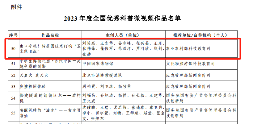 近日,科技部、中国科学院联合公布2023年全国优秀科普微视频作品评选结果,由农业农村部科技司指导,中国农科院生物所联合浙江师范大学、光明网制作的科普微视频《虫口夺粮!转基因技术打响“玉米保卫战”》荣获全国优秀科普微视频奖。