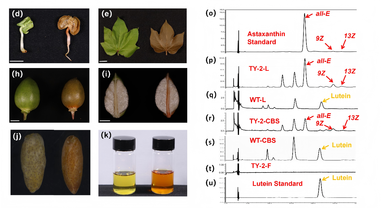 棉花是全球最重要的纤维作物,但长期以来研究主要集中于纤维本身,占植株生物量大部分的棉秆、棉籽等副产物开发不足,造成资源浪费。挖掘棉副产品的高附加值潜力,是提升棉花综合价值的关键。研究团队借鉴在玉米中的成功经验,引入莱茵衣藻的β-胡萝卜素酮化酶(CrBKT)和雨生红球藻的β-胡萝卜素羟化酶(HpBHY)两个关键外源基因,利用高效表达系统,并精准引导酶在质体中的高效表达,在现代棉花品种“中棉49”中成功合成虾青素。获得的转基因棉花在叶片、茎秆、棉铃甚至棉籽油中均积累橙红色虾青素,其中叶片含量最高达61.03毫克/千克(鲜重),与富含虾青素的玉米籽粒相当,这为天然虾青素的供给开辟了新的途径。