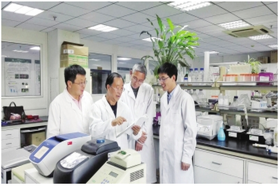 图为郭三堆(左二)在实验室指导助手和学生。资料图
