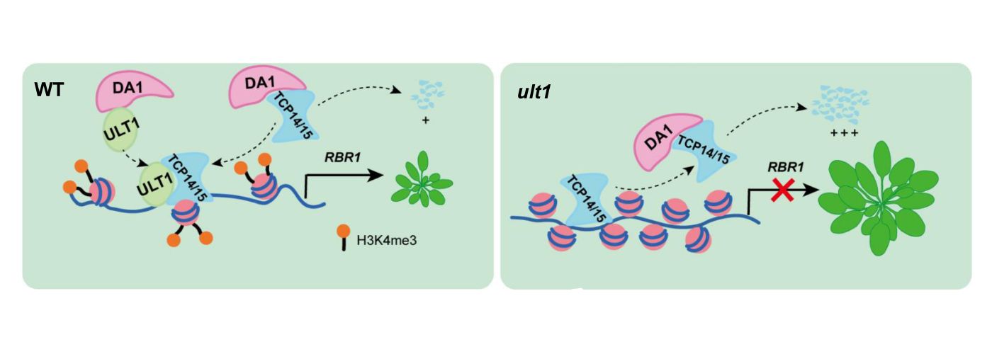 器官大小尤其是种子大小是植物重要的农艺性状,也是影响农作物产量的主要因素之一。植物器官大小,受到遗传、表观遗传和环境因素等协同调控。目前虽然已报道了一些调控植物器官大小的关键基因,但其表观遗传分子机制和调控网络尚不清楚??蒲型哦臃⑾?,一个表观遗传调控蛋白,可以与转录因子结合,被招募到下游靶基因上改变组蛋白甲基化修饰水平,激活靶基因表达,影响植物细胞大小和细胞数目,进而决定器官大小。