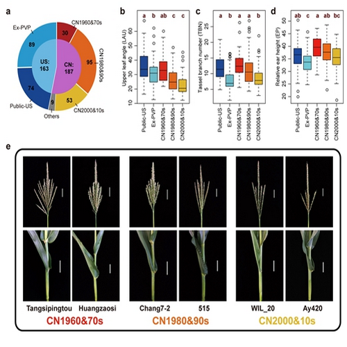 利用现代分子生物学研究手段,他们还证明了两个在现代玉米育种过程中受到选择的基因ZmPIF3.3和TSH4,分别在调控玉米株高(穗位高)和雄穗分枝数方面发挥重要作用。