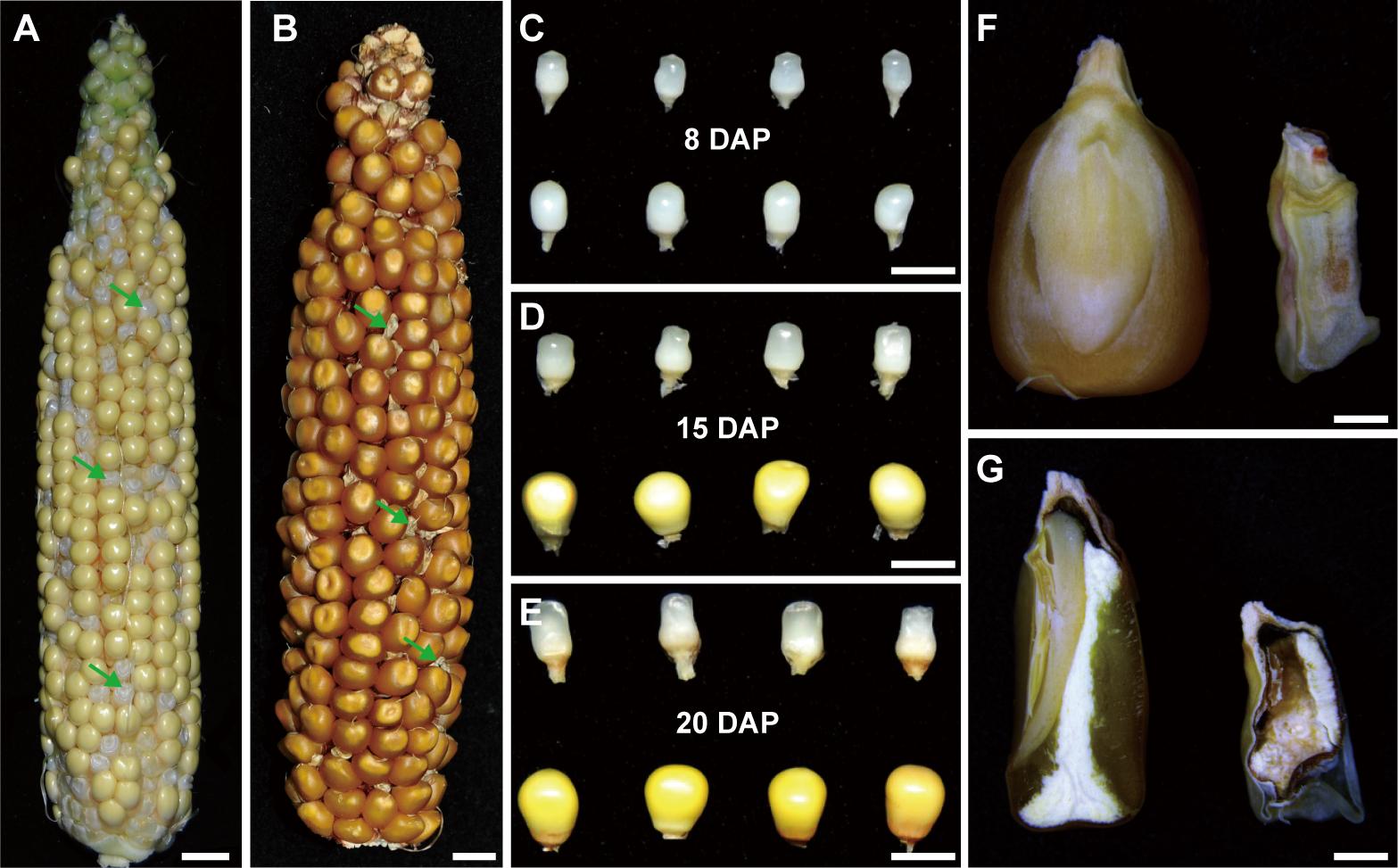 玉米籽粒发育直接影响玉米产量,涉及复杂的遗传调控网络,包括线粒体基因的表达。线粒体作为一个半自主细胞器,为籽粒发育提供能量,线粒体功能缺陷会导致生长缓慢和形态异常甚至停滞发育等问题。已有研究中发现P亚型PPR蛋白是一种靶向线粒体的RNA结合蛋白,具有RNA剪切、编辑和维持线粒体编码基因转录本3’末端稳定性三类功能。