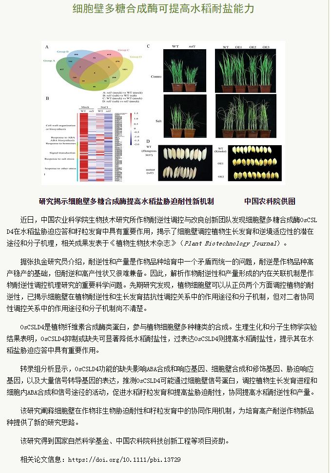 近日,中国农业科学院生物技术研究所作物耐逆性调控与改良创新团队发现细胞壁多糖合成酶OsCSLD4在水稻盐胁迫应答和籽粒发育中具有重要作用,揭示了细胞壁调控植物生长发育和逆境适应性的潜在途径和分子机理,相关成果发表于《植物生物技术杂志》(Plant Biotechnology Journal)。