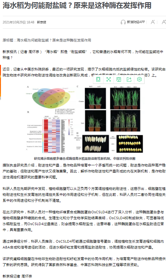 近日,记者从中国农科院获悉,最近的一项研究发现,揭示了水稻细胞内抵抗盐碱侵蚀的秘密。该研究由院生物技术研究所作物耐逆性调控与改良创新团队完成,相关成果发表在《植物生物技术杂志》上。