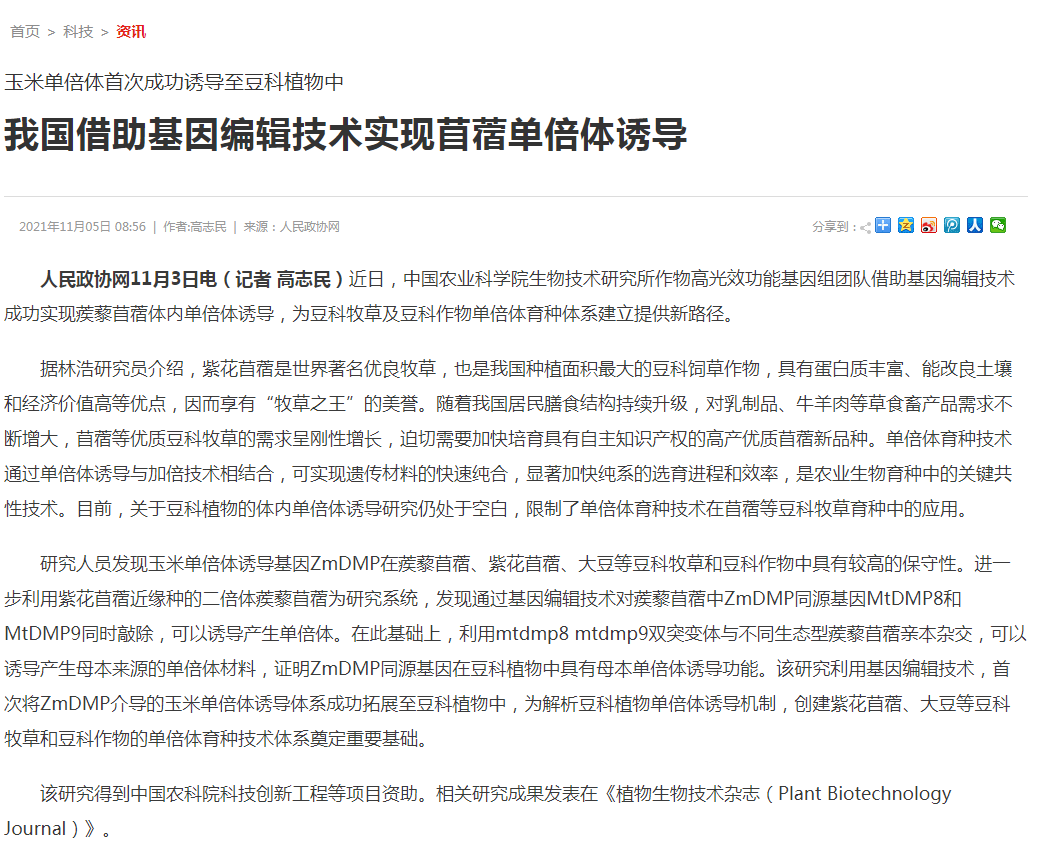 人民政协网11月3日电(记者 高志民)近日,中国农业科学院生物技术研究所作物高光效功能基因组团队借助基因编辑技术成功实现蒺藜苜蓿体内单倍体诱导,为豆科牧草及豆科作物单倍体育种体系建立提供新路径。