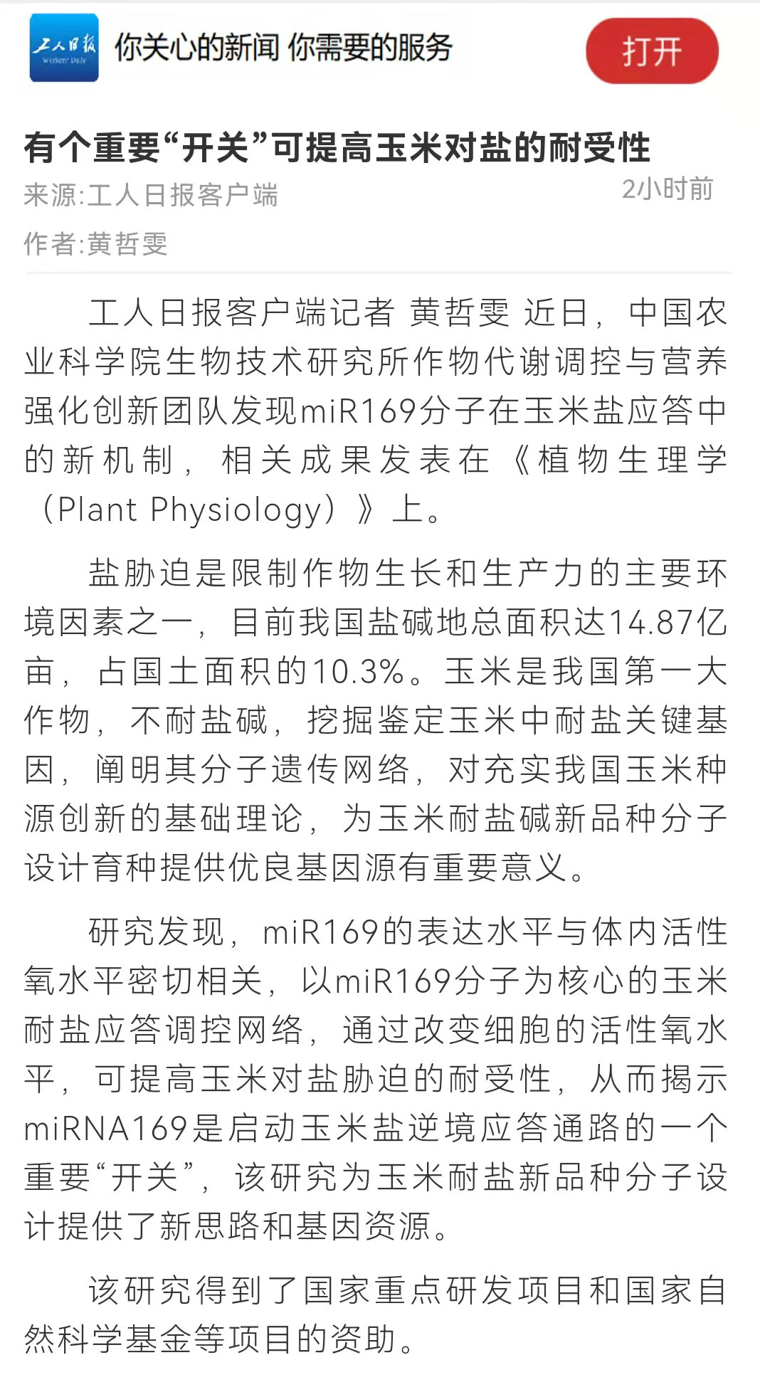 工人日报客户端记者 黄哲雯 近日,中国农业科学院生物技术研究所作物代谢调控与营养强化创新团队发现miR169分子在玉米盐应答中的新机制,相关成果发表在《植物生理学(Plant Physiology)》上。
