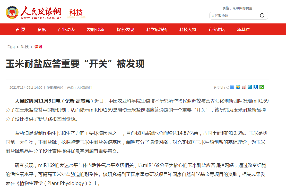 人民政协网11月5日电(记者 高志民)近日,中国农业科学院生物技术研究所作物代谢调控与营养强化创新团队发现miR169分子在玉米盐应答中的新机制,从而揭示miRNA169是启动玉米盐逆境应答通路的一个重要“开关”,该研究为玉米耐盐新品种分子设计提供了新思路和基因资源。