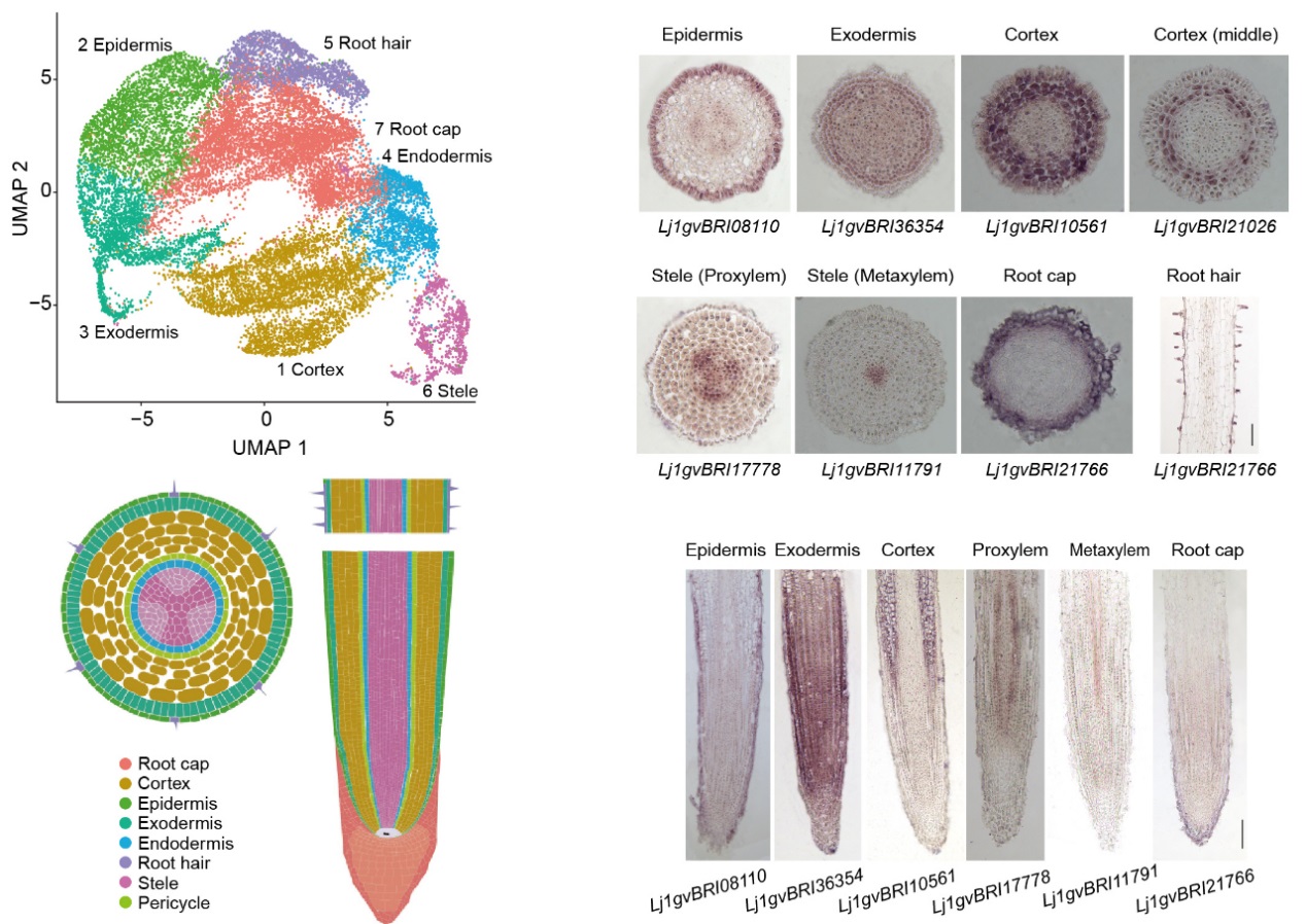 记者从中国农业科学院获悉,近日,该院生物技术研究所作物生物技术育种创新团队与国内其他科研单位合作,共同绘制完成首个豆科植物百脉根的根尖单细胞表达图谱,鉴定出根尖的主要细胞类型,发现新的细胞类型特异基因,并分析了各个细胞类型的潜在功能,对研究豆科植物根系发育、结瘤固氮以及生物育种具有重要意义。