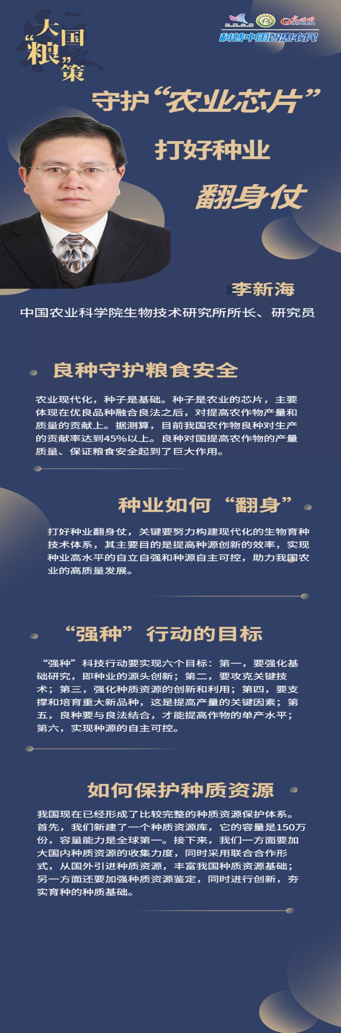 光明网联合科普中国、中国农业科学院、农业农村部人力资源开发中心、中国农学会,推出《大国“粮”策专家谈》栏目,邀请专家们畅谈“粮”策。本期《大国“粮”策专家谈》邀请到了中国农业科学院生物技术研究所所长、李新海研究员,请他来聊一聊应该如何发挥科技力量,保护好我们的“农业芯片”。