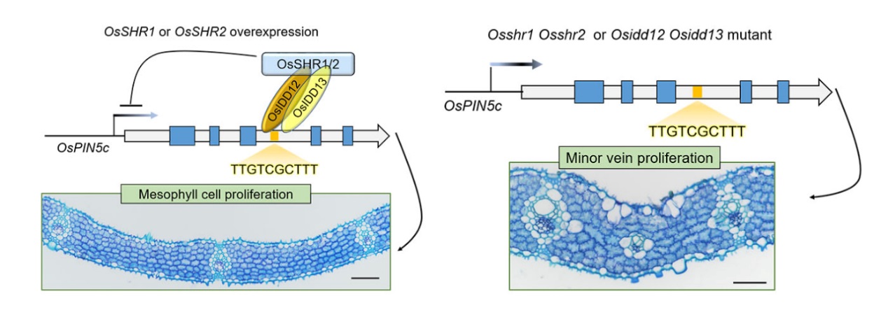 该研究发现,水稻中转录因子OsSHR1/2与OsIDD12/13形成复合体,并结合到基因OsPIN5c上,形成SHR-IDD-PIN分子??榭氐骺鼗騉sPIN5c的表达,影响水稻叶脉生长素的分配,从而控制小脉密度和叶肉细胞、维管束鞘细胞的特殊排列模式,在水稻中创制类似碳4的解剖学结构。