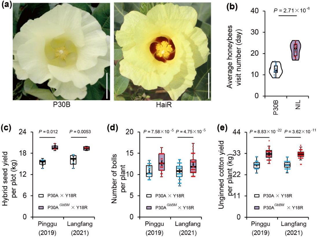 该研究从海岛棉中克隆到一个控制花瓣基斑形成的关键基因GbBM,该基因在陆地棉进化过程中发生突变而失去功能。研究发现,GbBM通过直接与黄酮类物质合成基因GbCHS、GbFLS、GbDFR和GbANS启动子结合,进而调控花瓣基斑的形成。利用该基因恢复陆地棉花瓣基斑性状后,可以显著提升传粉昆虫到访率,并提高三系杂交种的产量。
