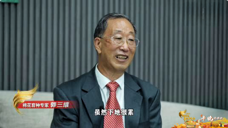 从机场匆匆赶到总台丰晚采访现场的郭三堆,看不出倦怠。年逾古稀的他精神矍铄,和他的学生、中国农科院生物所副研究员王远说起棉花种业发展、农民培训和农业教育问题,更是滔滔不绝。一年中有大半时间扎在棉田里的郭三堆,为丰晚录制特意穿了一身正装,系了红色领带,全程话题都离不开“下地”“育种”“抗虫”“培养人才”这些他为之付出大半生心血的科研工作。