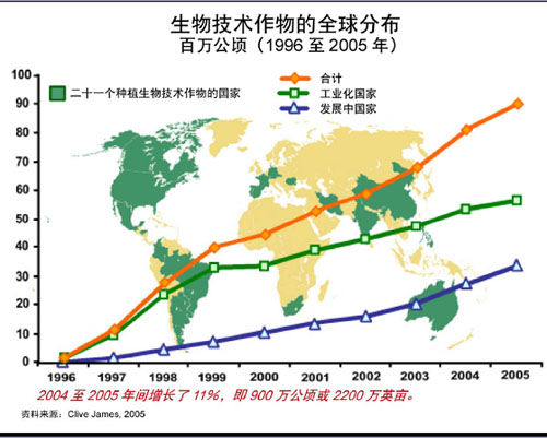 [黄大昉]:我先回答你第一个问题。因为这几年转基因作物在发展中国家种植面积上升速度非???,全世界转基因作物的面积已经达到九千万公顷(2005年),比1996年开始大规模种植转基因作物,那时候面积是170万公顷,不到十年增加了那么多,而且最近几年在发展国家增加得更快,说明发展中国家更需要转基因作物。大家知道全世界现在的人口是60亿左右。全世界的粮食产量大概才18亿多公斤。每年仍然有8亿贫困人口处于半饥饿状态。例如,大家所知道的非洲南部,非洲南部整个的贫困人口就占整个世界贫困人口的四分之一,而且这部分人口数在今后的十几年间还要增长一倍。