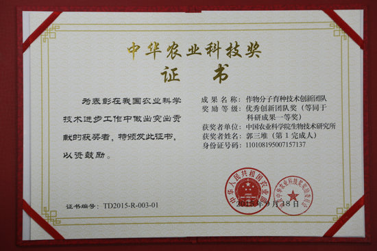 我所作物分子育种技术创新团队喜获2014-2015年度中华农业科技奖优秀创新团队奖,该团队在郭三堆研究员的带领下,长期从事棉花抗逆高产分子生物学和分子设计育种研究工作。